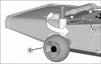 b. Rotate mower wheel (B) 90° and align hole in wheel shaft with pin.