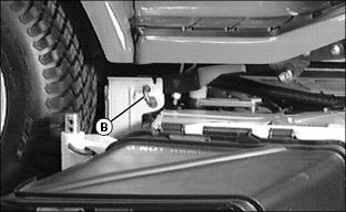 8. Place lift arms between rear mower deck lift brackets and pull rear J-pin (B) out to attach brackets to lift arms on each side of mower.