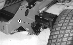 11. Push lever (E) up so pin on lever is locked in hole on left side of frame.