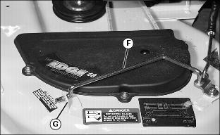 12. Remove drive belt tension rod (F) from bracket (G) and move rod all the way out toward you as far as it will go.