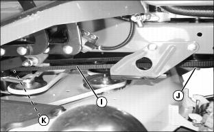 14. Install mower drive belt (I) on machine drive sheave (J) and mower drive sheave (K).