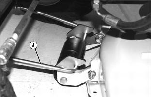 12. Remove front lift rod assembly (J) from machine and mower deck.