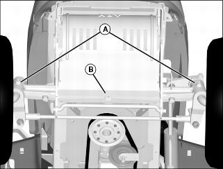 2. Lubricate front spindles (A) and axle pivot (B) with recommended grease.