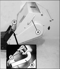 3. Rotate transport lever (B) until locking pin disengages from slot (C). Allow transport lever to lock into hole in shield (D).