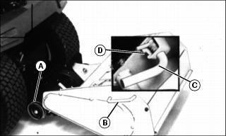 • To increase tilling depth, turn lift rod (B) out of clevis (C) and (D).