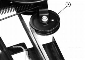 3. Turn bolt (D) so idler (E) moves up in the slot.