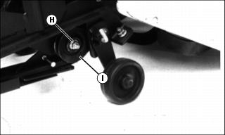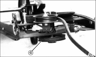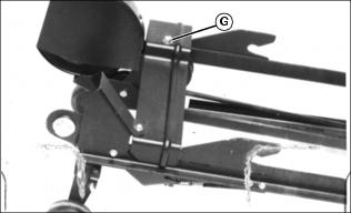 • To loosen belt, turn bolt (G) clockwise until 3 mm (1/8 in.) clearance exists between rod end (H) and vertical frame rail (C).