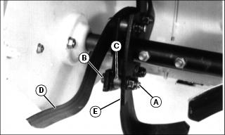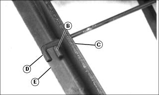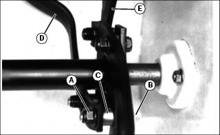 • If rod end is in position (D), extends beyond horizontal frame rail (E), the belt is too loose and must be tightened.