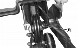 • To tighten belt, turn bolt (G) counter-clockwise until 3 mm (1/8 in.) clearance exists between rod end (H) and vertical frame rail (C).