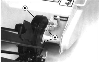 2. Loosen nut on bolt (A). Move belt guide (B) away from belt.