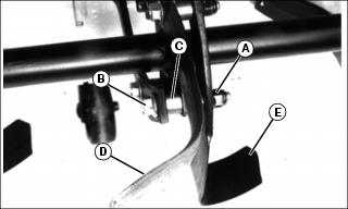 • Right Cluster: Remove nuts (A), bolts (B), spacer (C), two left tines (D), and two right tines (E). Install the new tines and hardware exactly as the old tines and hardware were positioned. Use the pictures to help you install tines correctly.