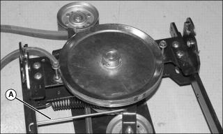 4. Push the arm to the right. Point belt guide toward drive sheave, as shown. Tighten nut on capscrew (A).
