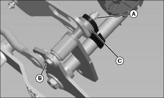 1. Remove and retain nut (A) and slide bolt (B) just enough to remove and retain spacer (C).