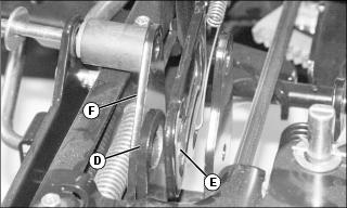 2. Install the lift arm (D) between lift lock bracket (E) and connector bracket (F) by sliding the lift arm inside the tractor frame from the rear of the tractor.