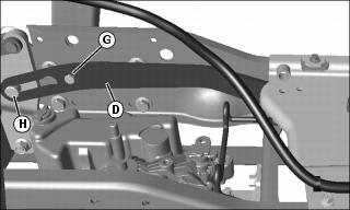 3. Install the slotted end of the lift rod (D) to the rear of the tractor onto the lift bracket boss (H).