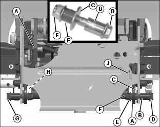 5. Install the larger OD boss outer spacer (I) through the lift bracket (D) from inside out and install washer (J) onto the larger boss. while sliding the bolt through these items.