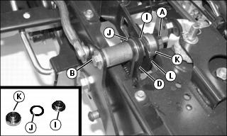 6. Install smaller OD inner spacer (K) through the lift lock bracket (L) and continue sliding bolt (B) through and secure with nut (A) removed earlier. Tighten to 60 N•m (45 lb-ft).