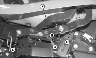 12. Install forward (O) and reverse pedals (P), and secure with nuts (Q). Do not tighten nuts.