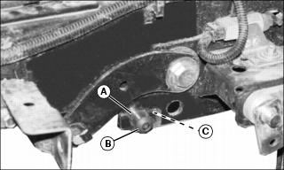 1. Remove and retain nut (A) and slide bolt (B) just enough to remove and discard spacer (C).