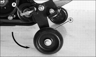 2. Swing wheel assembly (B) into down position. Make sure locking pin engages to lock wheel in down position. Repeat for other wheel assembly.