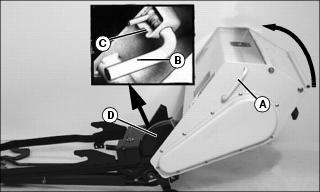 3. Rotate transport lever (B) until locking pin disengages from slot (C). Allow transport lever to lock into hole in shield (D).