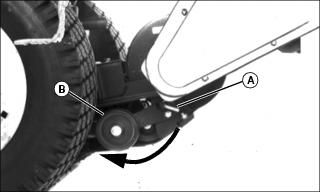 2. Swing wheel assembly (B) into up position. Make sure locking pin engages to lock wheel in up position. Repeat for other wheel assembly.