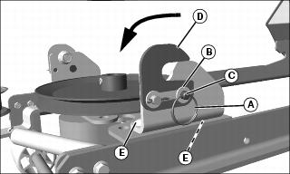 2. Install yoke (A) to lift bracket (E) (assembled earlier to tractor) and secure with a drilled pin (C), and locking ring (D).