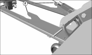 4. Place tiller frame hooks (F) over rear support pins (G) at rear tractor frame.