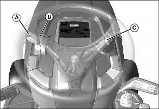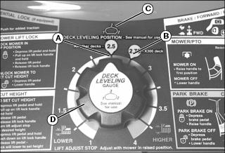 3. The label for the cutting height knob is located on the console of the machine. This label shows deck leveling positions (A & B) and location of deck leveling adjustment points (C). The location of adjustment points will vary slightly between decks: