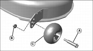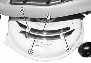3. Remove bolts (A) and right (B) and left (C) mower deck gates. Retain hardware.