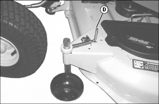 4. Set mower cutting height knob (D) to the deck leveling position for your specific mower deck, and lower deck against stop: