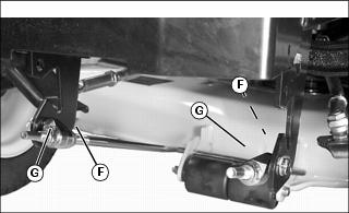 c. Adjust mower level, if necessary, by loosening rear nut (F) equally on each side of front lift rod. Turn front nut (G) equally on each side clockwise to raise front of mower or counterclockwise to lower it. Tighten rear nuts after adjustment is complete.