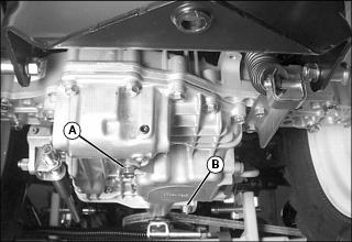 NOTE: Transaxle is divided into two internally connected cavities. Rear drain plug (A) will drain differential gear side and front plug (B) will drain hydrostatic side.
