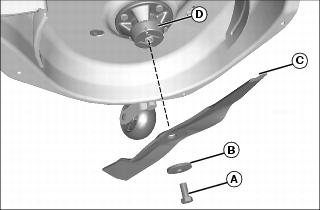1. Make sure deflector cup (D) is seated properly between mower spindle and blade.