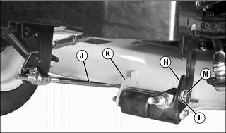 · Remove locking clip (L) from stud (M) on each side, and remove front draft rod from draft bracket (N). Note orientation of stud offset when removing, correct offset is above rod.