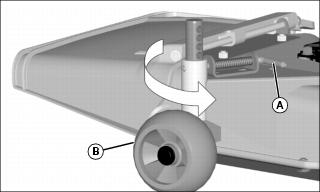 b. Rotate mower wheel (B) 90° and align hole in wheel shaft with pin.