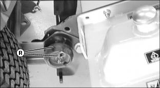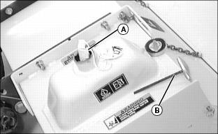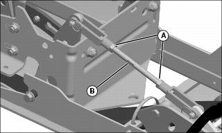 • Loosen jam nuts (A) and adjust rod (B) so that the transport latch aligns with the engagement hole and can be engaged when the tiller is in the raise position.