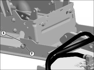 9. Slide tiller under tractor and raise back side of tiller frame to align and engage frame slots (E) with rear mounting bolts (F).