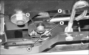 5. Remove locking ring (D), pin and washer (E) from clip latch (F). Open clip latch to lift off mounting stud (G). Retain hardware.