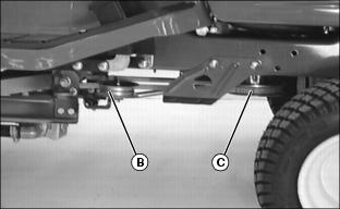 4. Move idler sheave (B) to the right and remove belt from PTO sheave (C).