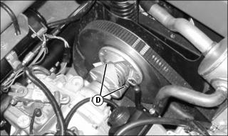 5. Through access hole (D), use compressed air to blow dust and debris out of clutch. Also blow dust and debris out from underneath the belt along the main shaft.