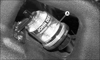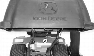 The material collection system requires unrestricted air flow from mower deck to bags for best performance. A fill indicator located on the bagging chute measures air flow through the system. As the grass bags become full, air pressure in the chute increases causing yellow diaphragm (A) to rise. The indicator will also show a hopper full condition if the chute is plugged somewhere between the indicator and hopper.