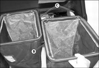 3. Slide bags (B) into position on support frame (C) so the safety decals are visible at rear of machine.