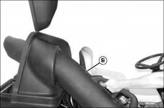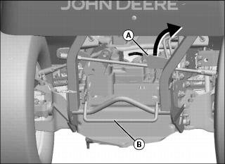 4. Apply foot pressure to latch rod (B) to disengage hopper frame latches from machine frame.