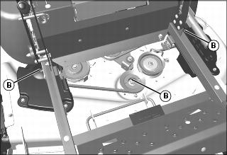 • Lubricate three mower deck spindle grease fittings (B) with two pumps of grease at specified interval.