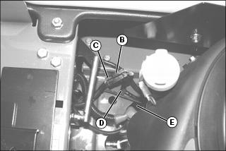 2. Remove clutch wiring harness from retaining clip (D), and lower harness and connector (C) through hole (E).