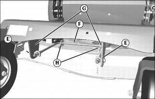 7. Remove locking clips (E), and remove front draft rod (F) from draft bracket (G) and mower deck bracket (H).