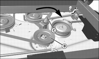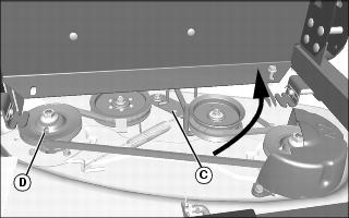 • Install 3/8-inch ratchet onto square hole (C) in tension arm and rotate clockwise to release tension on belt, while removing mower belt from center spindle sheave (D).