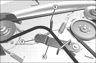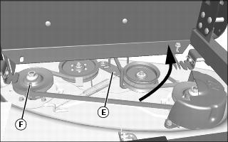 • Install 3/8-inch ratchet onto square hole (E) in tension arm and rotate counterclockwise to release tension on belt, while installing mower belt onto left spindle sheave (F). Make sure belt is properly seated on all sheaves.