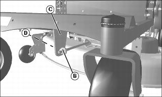 6. Install stud (B) onto front draft bracket (C). Secure with locking clip (D).